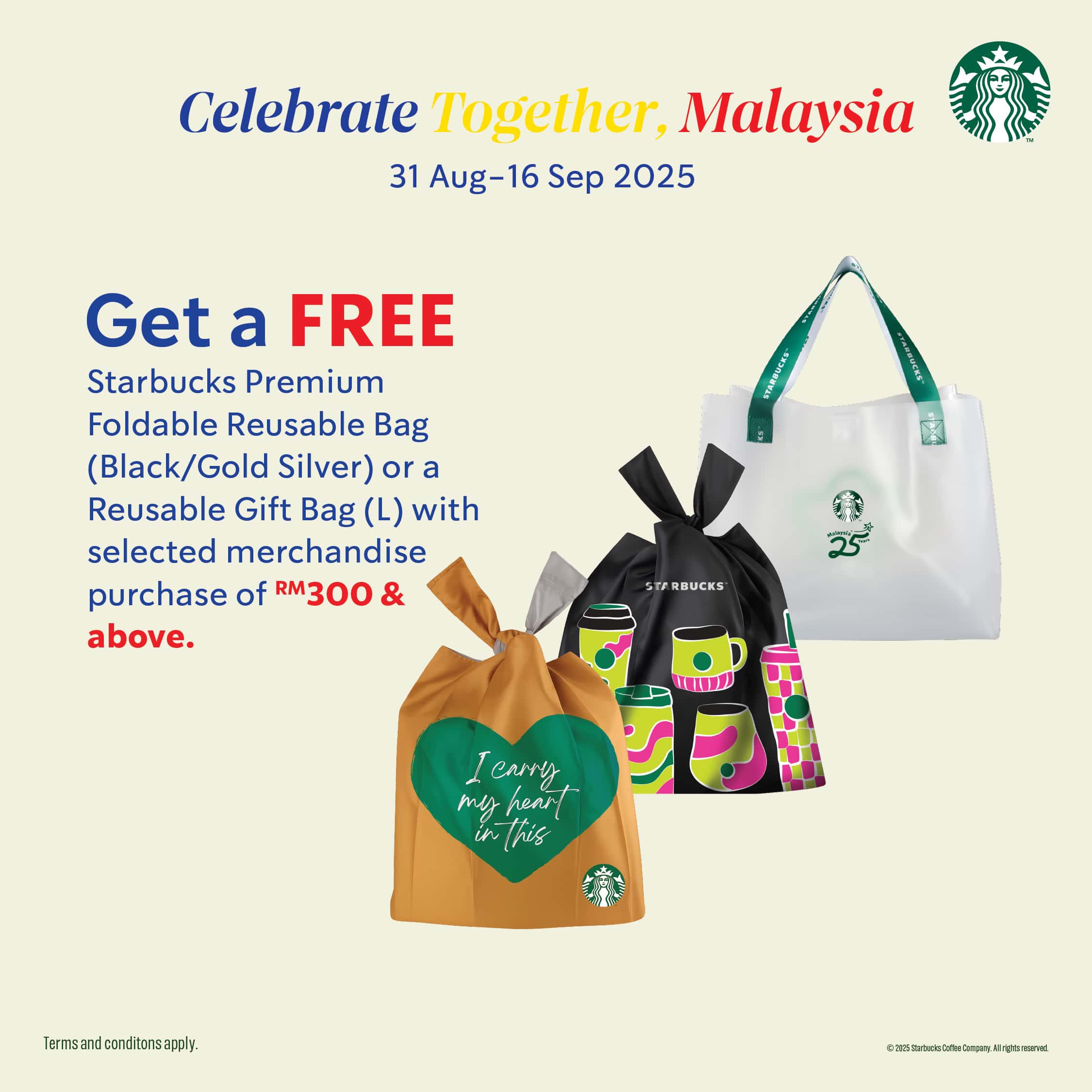 Enjoy the exclusive Merdeka promotions on beverages, merchandise, and even a FREE reusable bag with minimum spend of RM300 on merchandise.